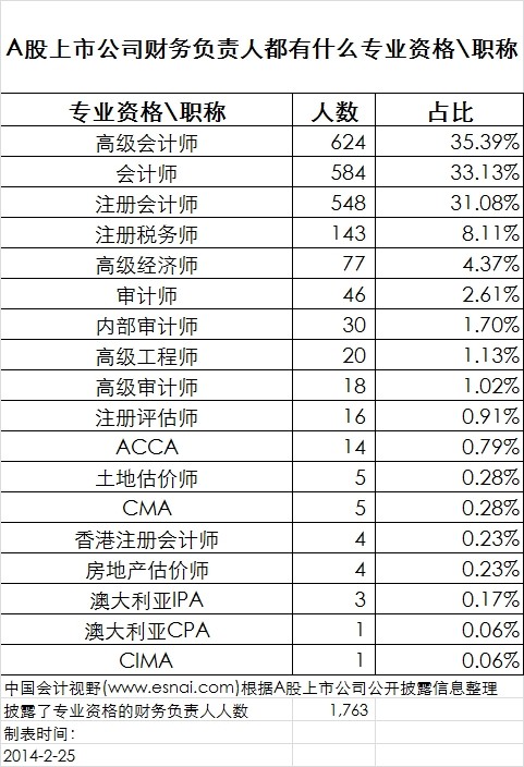 (撰文:会计视野)根据学院中国会计视野网的统计,上市公司财务负责人中,公开披露有专业资格或职称的人数有1757人。其中,拥有的最多证书前三名分别为高级会计师、会计师和注册会计师。