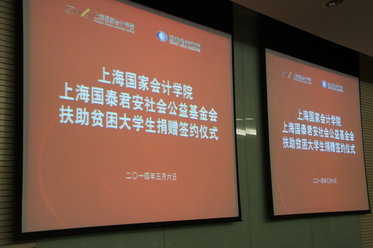 (撰稿:赵云燕;摄影:刘廷和)3月6日,学院与上海国泰君安社会公益基金会扶助贫困大学生捐赠签约仪式正式举行。国泰君安证券股份有限公司监事会郑会荣主席,上海国泰君安社会公益基金会殷伟频秘书长,院李扣庆院长,上海国家会计学院研究生部颜延主任共同出席了此次签约仪式。