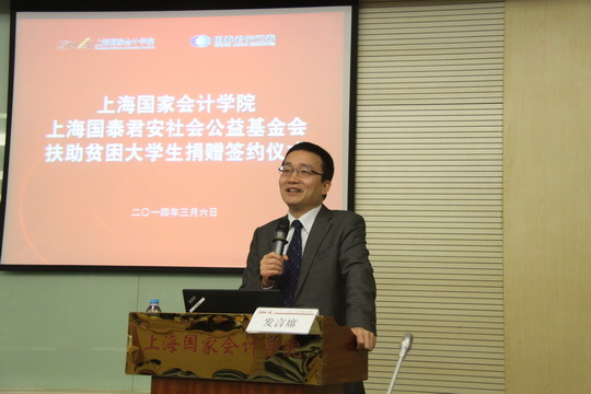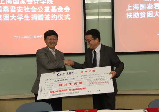 上海国泰君安社会公益基金会,是由国泰君安证券股份有限公司发起,由上海市金融办主管的公益基金会。自成立以来,上海国泰君安社会公益基金会一直热心公益,通过义捐义卖、结对助学、解困帮扶、援建希望小学等,积极履行着自身所肩负的推动慈善公益事业的责任。上海国家会计学院是国泰君安社会公益基金会捐助的沪上四所高校之一。自2013年5月开始,殷伟频秘书长带着郑会荣主席的嘱托,展开了上海国家会计学院助学圆梦计划,资助2012级共21名研究生,解决了这些家庭贫困学生的生活困难。同时,国泰君安社会公益基金会殷秘书长不定期到访研究生部,开展学生座谈会,疏解这些学生们的心理压力和求职困境,从物质上和精神上缓解被资助研究生的困难。