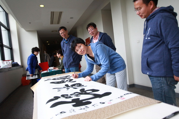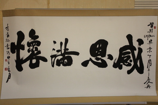 再享团圆时,同学们共同在吉尼斯世界纪录获得者李青林老师的作品——“十年聚首 感恩满怀”上签名,并将这幅作品义拍。经过三十几轮激烈的竞拍,最终由黄彩英同学以3.6万元的价格拍得。该笔善款将以班级的名义,用于公益事业,帮助有需要的人。