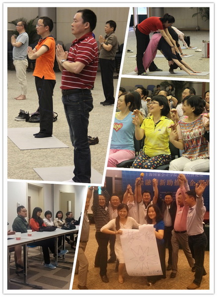 本期培训安排了瑜伽健身操课程,大家换上舒适的运动服,一起兴致勃勃地走进瑜伽快乐的殿堂。老师先对学员进行瑜伽饮食的理论教育,然后在舒缓音乐的流淌中,引导大家渐渐放松浮躁的心情,尽情地伸展身体的各个部位。在均匀而悠长的呼吸中,大家沉淀了自己的杂念,感受湮没在繁琐事务中久违的宁静,唤醒了灵魂深处真正的自我,收获了身心合一的喜悦。