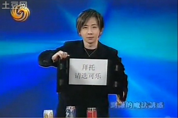 在刘谦参加一个访谈类节目的结尾时,主持人鲁豫请求他在现场最后教大家一个小魔术,他欣然答应了。首先,在舞台的中央,摆了一张小桌子,上面摆放了三罐听装饮料,一罐可乐,一罐凉茶,还有一罐咖啡。然后,他随机选了一位观众上台,让观众随便选一罐饮料,但是观众会选哪罐饮料,刘谦已经在前一晚做梦梦到,并且在魔术开始前已经将这一种饮料事先装在了一个牛皮袋子里。当然,他成功了。这个魔术叫做预测未来。预测未来的能力,是不是让人心动呢?当然解密之后我们知道这根本不是预测能力,而只是因为刘谦在一块立在桌子的挡板上写上了“拜托,请选可乐”这句话而已。