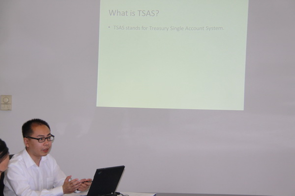 蔡志伟老师结合SNAI的情况,为柬埔寨官员详细介绍了国库集中收付的主要内容及SNAI在运用这一系统的情况,尤其在资金管理、政府采购等方面的应用情况。柬埔寨官员对相关财政资金管理问题简要介绍了柬埔寨的情况,并就有关问题进行了交流。
