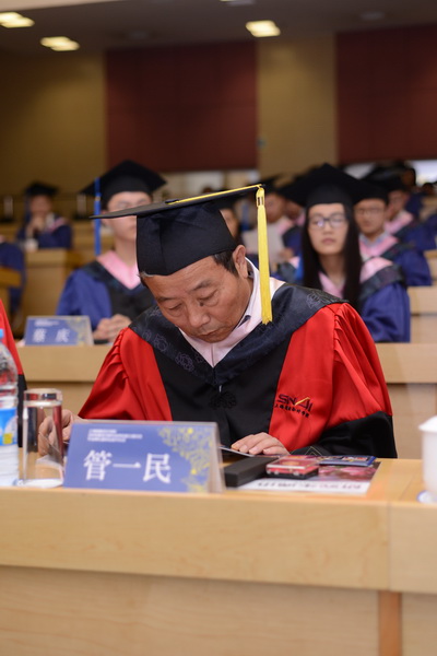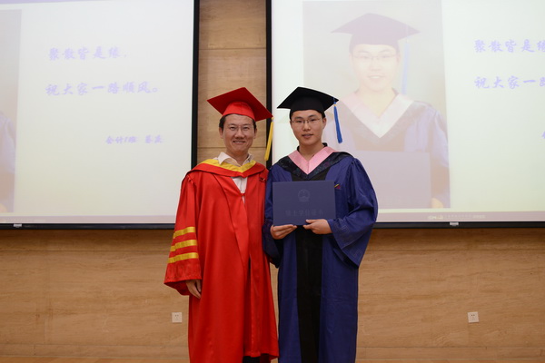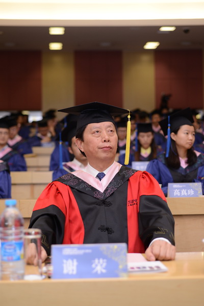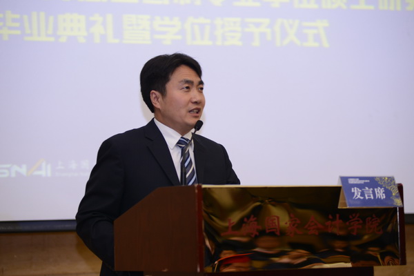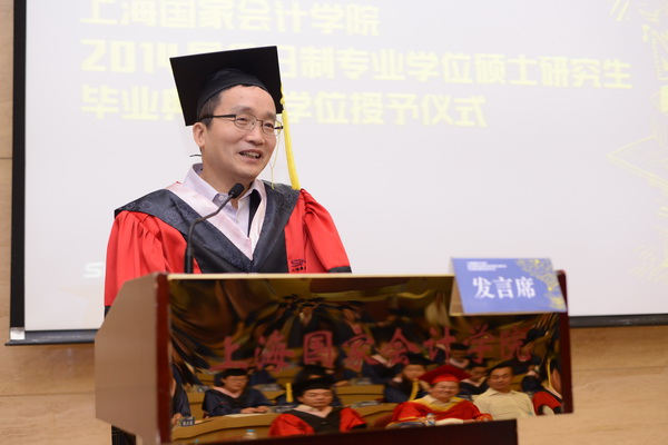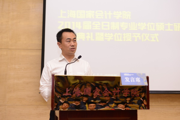 李扣庆院长向获得硕士学位的同学们表示祝贺,并向长期给予工作支持、指导的财政部、上海市教委及带领和陪伴同学们的各位老师和他们的家人致以诚挚的感谢。在同学们行将离开母校之际,李扣庆院长以“慎思笃行,兼济天下”作为临别赠言。校友代表、上海市教委李长治处长要求同学们亲近自然、保持一份自然之心;坚持操守、不做假账;热爱母校、回馈社会。国泰君安证券股份有限公司监事会主席郑会荣希望同学们在社会这所大学堂里继续发扬刻苦学的精神,保持良好的学习习惯,学会做事、学会爱人,有一颗孝敬父母之心。学院教研部单喆慜副教授希望毕业生终生保持学习的精神、探索的热情和坚韧的品质。童方磊同学作为毕业生代表也在典礼上做了发言。