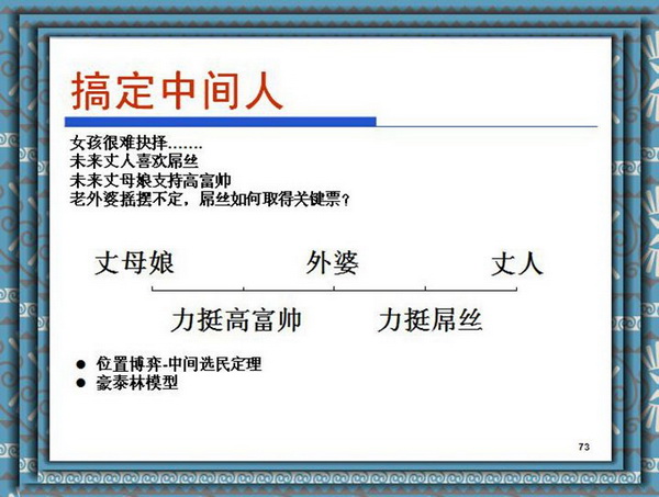 大学毕业在即,白富美面临人生重大抉择,选择屌丝还是高富帅,举棋不定。每一段婚姻背后都是两个家庭,未来丈母娘、老丈人以及外婆在白富美择偶上就发挥了关键作用。丈母娘喜爱高富帅、老丈人偏好穷屌丝、外婆属于中间选民,认为只要谁对孙女好就选谁。屌丝深谙位置博弈—中间选民的重要性,陪外婆聊天、决定蜜月旅行时带她去法国巴黎埃菲尔铁塔下跳广场舞,投其所好终于赢得白富美,屌丝成功逆袭。