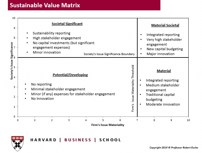 “在履行这一责任方面,我认为有三条途径:发布关键听众和重要性报告(Statement of Significant Audiences and Materiality,SSAM),这需要有一个取舍,有些利益相关方可能被排除在外;支持年度可持续价值矩阵,这是一个分别以公司重要性和社会重要性为坐标的矩阵(见下图);支持年度综合报告。