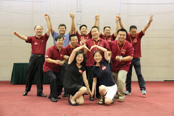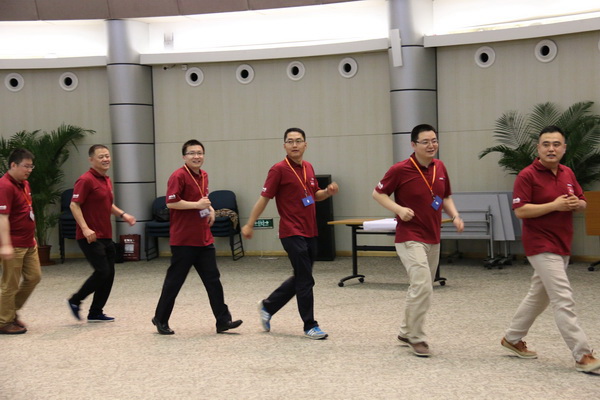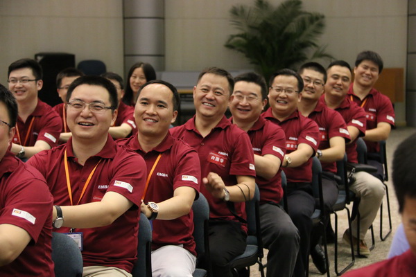 17:00,“入学指南”结束。这一天的活动很充实,SNAI项目组在18:00安排了“EMBA2014级新生团队拓展”,在这之前要先到第三餐厅用餐。18:00,身着注册时统一发放的EMBA项目T-shirt,大家同聚学院国际会议中心(初听这个大气的名字时本以为是在学院外的某个地方)。“桃花朵朵开”游戏作为开场,同学们嬉笑热闹成一团,时而奔跑,时而寻找,心中最希望的自然是某个“桃花”组织能收下自己成为“花瓣”的一员,但不被落单的诀窍却是眼疾脚快,敢于把自己剥离开来,寻到缺少“花瓣”的“桃花”。接下来是“抓手指”游戏和“团队组建和展示”。“团队展示”是最为喜人的。组建过程的时间无论长短,到了展示环节每个小组竟然都争先恐后地上台展示。第一组的一位四十有余的同学竟然是蹦跳着上了舞台,引来一片好奇的目光,这位同学在后来文娱活动也果然展现出非凡的“舞动”细胞,被同学们尊称为“舞帝”。再者,不是一家人不进一家门,四个小组中竟然有三个都把《朋友》作为队歌。“看来不仅小组内是朋友,没有边界大家都是朋友啊~哈哈~” 最后的“驿站传书”,第二组可真是厉害,两轮都正确传达指定信息。不管结果怎样,玩的确是开心。虽然意犹未尽,但转天就要正式上课,还是早些回去休息,养精蓄锐。