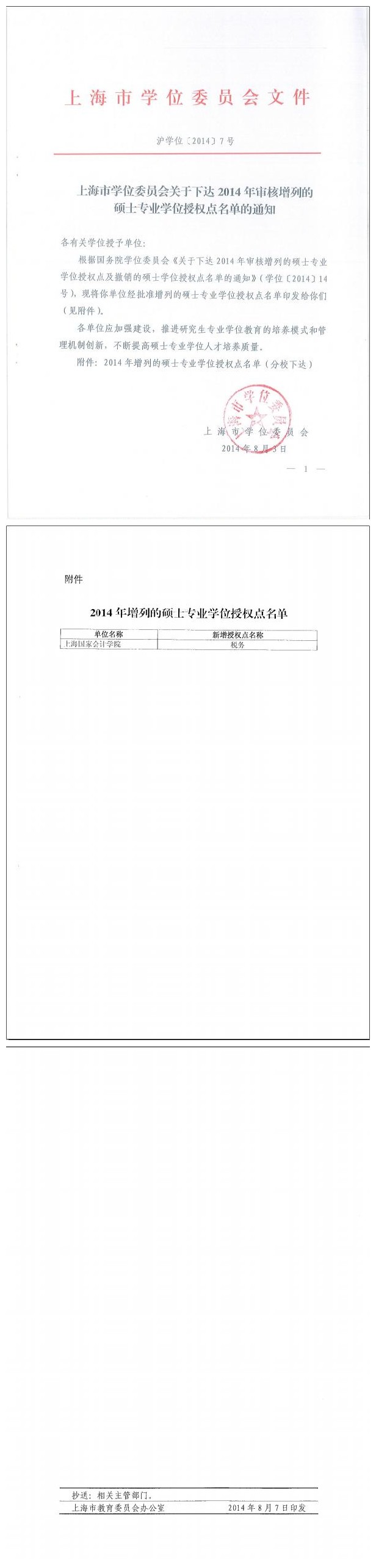 (通讯员:肖舒羽)(近日,我院接到《上海市学位委员会关于下达2014年审核增列的硕士专业学位授权点名单的通知》(沪学位〔2014〕7号),根据国务院学位委员会《关于下达2014年审核增列的硕士专业学位授权点及撤销的硕士学位授权点名单的通知》(学位〔2014〕14号),我院被批准增列为税务硕士专业学位授权点,即将开展税务硕士专业学位研究生教育工作。
