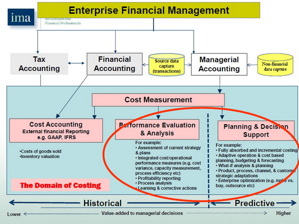 关于决策成本法与成本会计、管理会计之间的联系,White先生用了一张企业财务管理全图来加以说明。决策成本法聚焦于绩效评估与分析、战略规划与决策支持,即下图红圈内的部分,和外部财务报表的需求无关。