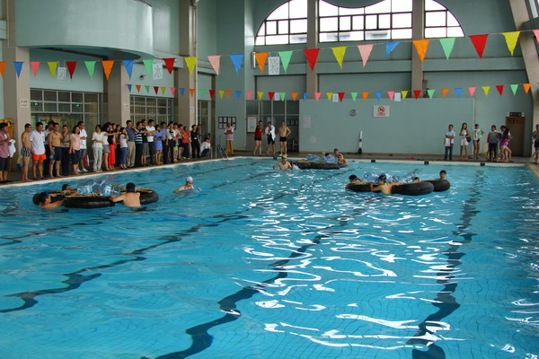 本届运动会主题为水上项目竞赛,运动会的第一项比赛项目是团体“扎筏泅渡”。在现场啦啦队的加油呐喊声中,各个参赛队快速利用组委会提供的轮胎、木板和绳子,捆扎成筏,并带上“战略物资”开始泅渡,这个比赛项目充分考验了各参赛队的运动员的综合水平和团队合作能力。在泅渡过程中,各种困难层出不穷,有些队伍的“战略物资”不断地落入水中,只好重新放置再度起航;有些参赛队用力不均,推着皮筏原地打转,虽力不前;有些团队,虽然最先到达终点,但是由于体力出了问题,在把战略物资转移上岸的过程中费尽周折。一番激烈角逐,教务部团队获得该项目的冠军,行政财务部和后勤部分获亚军和季军。