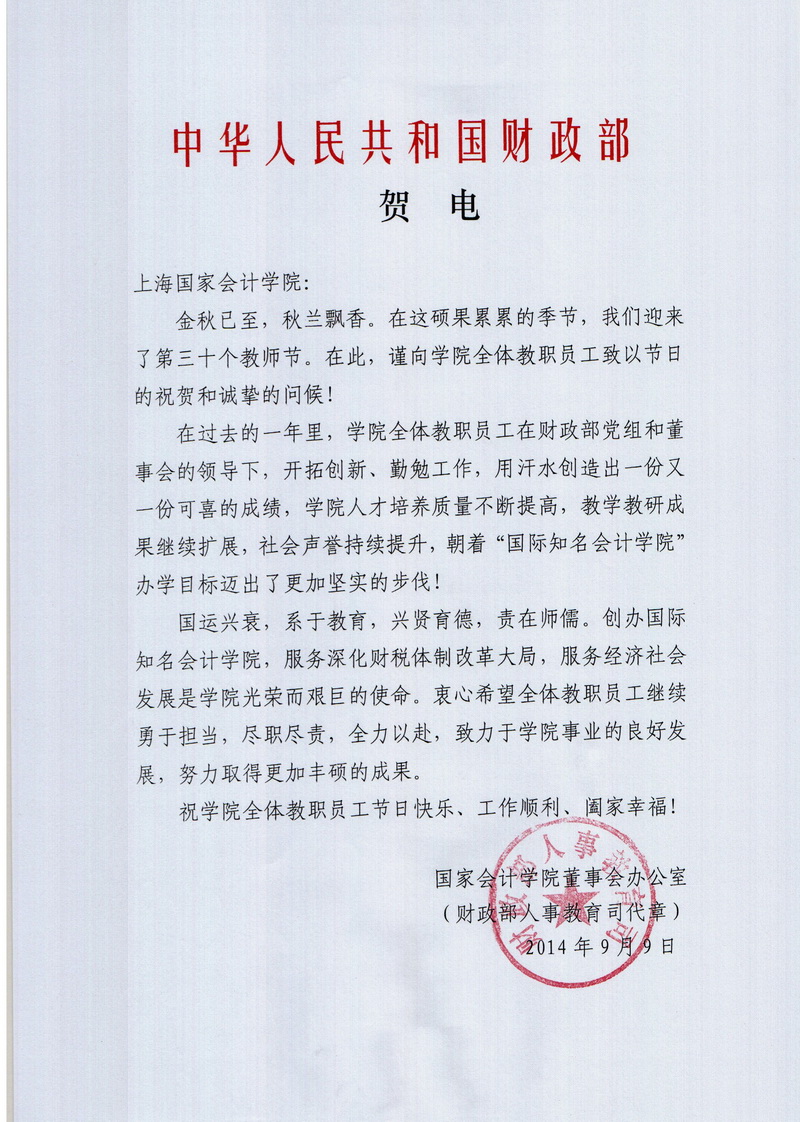 财政部致学院教师节贺电