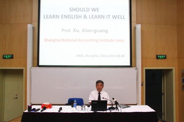 (撰稿:陈宝莲;摄影:毛昭文)8月8日一教100人报告厅,我院徐宪光教授应邀为参加我院首期研究生暑期学校的90名研究生做了题为Should We Learn English & Learn It Well (我们是否应该学英语并把它学好) 的全英文沙龙讲座。徐教授超凡脱俗的谈吐、温文尔雅的气质、地道流畅的英语,令在场的来自全国50所高校的研究生们深深为之折服。