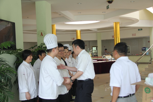 刘勤副院长(中)在后勤办易宏勋主任(右一)的陪同下慰问餐厅员工