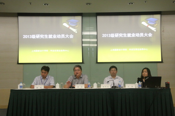 (撰稿:李虹;摄影:刘荣光)为了全面做好2013级全日制研究生的就业工作,使研究生能够更加全面深入地了解就业流程及当前的就业政策,激发就业积极性和提高就业技能和竞争能力,我院于10月11日举行了2013级全日制研究生就业动员大会。上海市学生事务中心副主任田磊、中国人保资产管理股份有限公司运营总监兼人力资源部总监胡伟益、研究生部主任颜延老师和就业指导中心王欣老师出席了此次大会,并作发言。大会由学生工作办公室钟雪冰老师主持。大会座无虚席,13级研究生认真倾听、积极参与互动交流。
