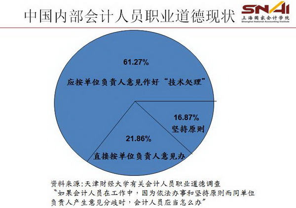 如果会计人员在工作中,因为依法办事和坚持原则而同单位负责人产生意见分歧时,会计人员应当怎么办?这个问题已经成为当今社会一直困扰着内部会计从业人员的“头号敌人”,而根据2004年天津财经大学有关“中国内部会计人员职业道德现状”的调查,结果显示,在面对上述问题时,能够坚持准则的内部会计人员仅仅为16.87%,大多数会计人员因为害怕丢失工作等原因,而成为了单位负责人的“帮手”。