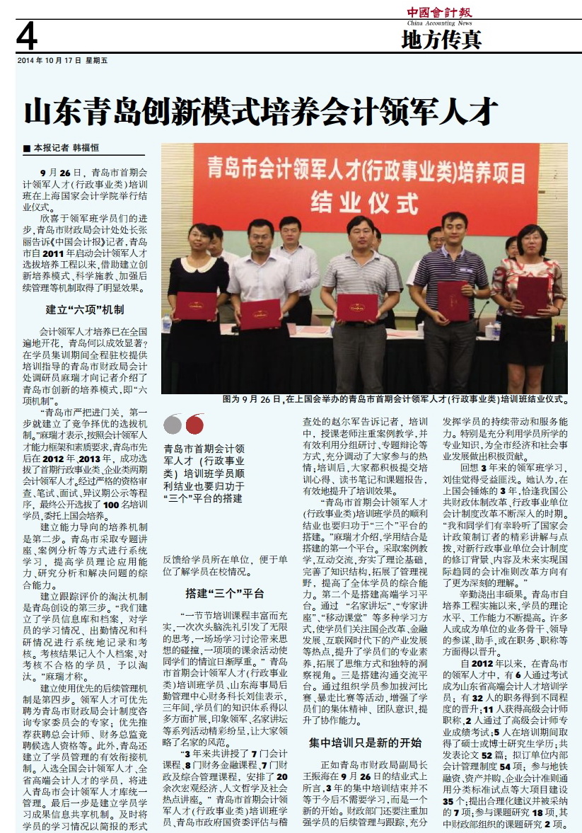 山东青岛创新模式培养会计领军人才【中国会计报,2014年10月17日】
