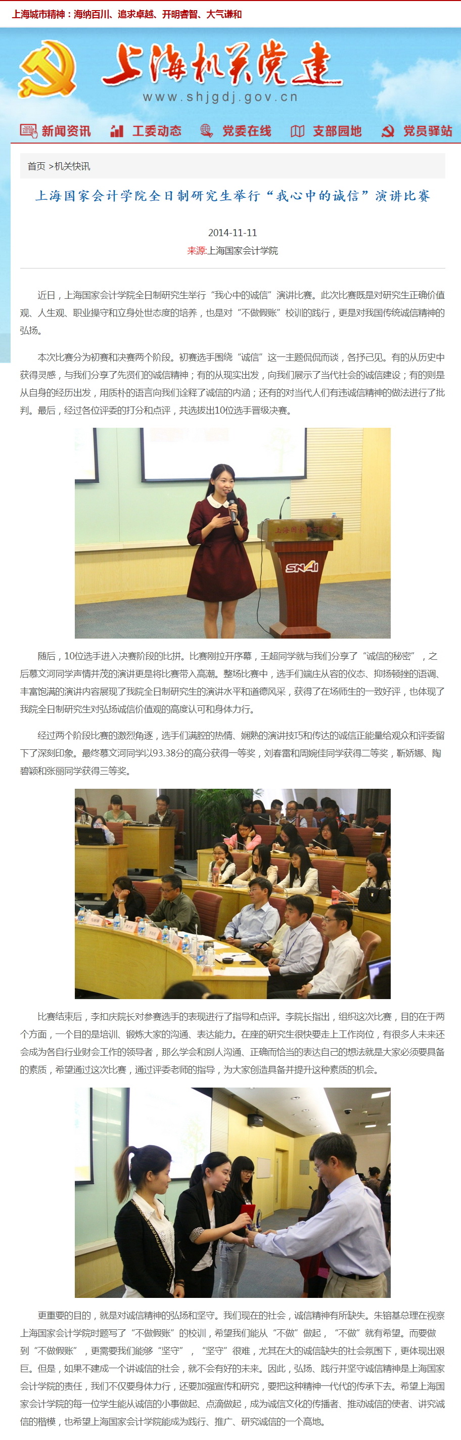 上海国家会计学院全日制研究生举行“我心中的诚信”演讲比赛【上海机关党建网,2014年11月11日】