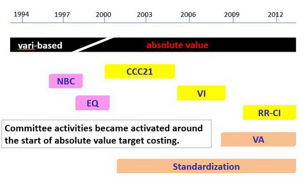 成本管理开始涉及越来越多的流程和部门。为此,从1982年为Starlet微型车建立目标成本加速委员会开始,丰田相继设立了NBC(1996,意指新基准轿车,第一代产品是Yaris)、EQ(1998,E是卡罗拉的开发代码)、CCC21(2000,21世纪成本竞争力建设计划,第一要求在所有车型和职能部门中削减成本)、VI(2005,价值创新,旨在降低设计成本)、Urgent VA(2008)、RR-CI(2010,Ryohin Renka,良品廉价)等委员会(见下图)。