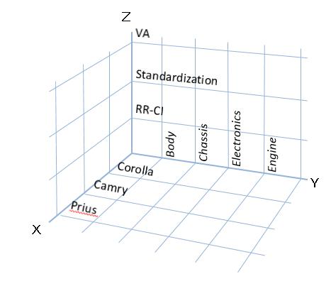由此,一个融合了车型、组件和成本管理的三维模型诞生(见下图)。“在确定一个轴后,就可以关注其他两个轴上的成本变化。” 小林英幸说。