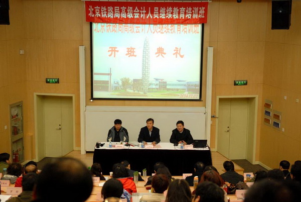 (撰稿、摄影:陈玲)12月,在年终岁尾各项工作非常繁重的背景下,北京铁路局在我院先后举办了两期高级会计人员继续教育培训班,参训学员包括来自北京、天津、石家庄3个铁路办事处和各个基层站段的财务人员共计240多位。12月2日上午,第一期北京铁路局高级会计人员继续教育培训班在我院第一教学楼举行开班典礼。出席的领导有我院教务部主任张各兴和北京铁路局财务处副处长刘洪海。北京铁路局会计科副科长杨云起负责主持开班仪式。