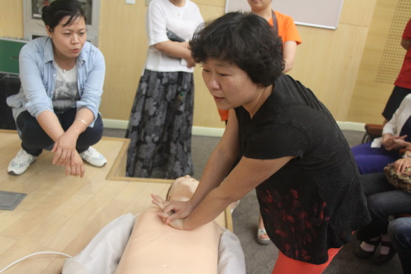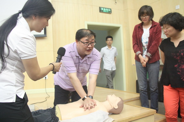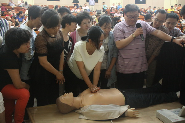 周主任的演讲从关于心肺复苏的急救常识讲起,周主任提到,在现代社会,人们因不规律的作息、不健康的饮食、精神焦虑以及遗传等原因,面临着心源性猝死的威胁。当突发心颤的危急情况下,我们应该如何实施急救与自救措施呢?周医生给出了详尽的解答,他告诉大家要警惕“喘、头晕、心悸、心律不整、胸闷”这四种症状,做好及时的排查与体检工作。当面临突发情况,周主任结合视频教学、现场模拟给大家示范如何进行心肺复苏的急救,学员也热情地参与到现场的模拟与互动环节,呼救120、判断病人是否意识清楚是必不可少的前提工作,在正确的身体部分进行频率为30:2的按压与人工呼吸时,大家需要注意手法、角度与力度的适当性。