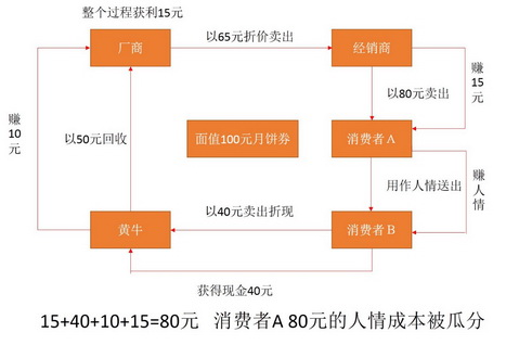 某知名月饼厂商,根据历史经验,预计中秋节会售出10000盒月饼,但是,在中秋节前十几天甚至一个月之前就开始出售约20000张月饼券。最开始,厂商将面值100元的月饼券以65元的低价卖给经销商,经销商将月饼券以80元的价格卖给消费者A,而消费者A将月饼券作为中秋节礼品送给消费者B,消费者B可能缺乏对月饼的需求,从而将月饼券以40元的价格折价卖给了黄牛进行兑现,最后在月饼券的到期日之前,月饼厂商以50元价格回收月饼券,这样,月饼券的整个生命历程已经走完。在这个过程中,我们可以发现,经销商赚了15元,消费者A送出了人情,消费者B通过折现获取了现金40元,黄牛通过变卖赚了10元,而厂商最后通过回收赚了15元,每个人都得到了好处,月饼没有生产,最后月饼券也回到了厂商手中。具体流程图如下: