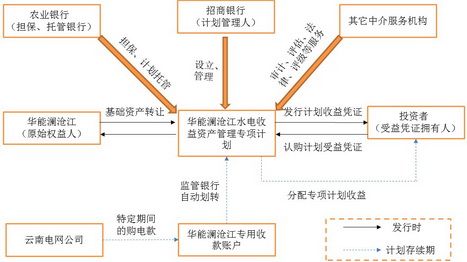 由上图可以看出,招商银行作为计划管理人,设立管理华能澜沧江水电受益资产管理专项计划,作为产生未来现金流的基础资产,由于在整个过程中并未实现真实出售,一旦原始权益人发生破产等情况,已经证券化的收益权是否能不随着原始权益人的破产而继续提供稳定的现金流缺乏法律保护,因此,中国农业银行在这个过程中为华能水电提供了不可撤销的连带责任担保的外部信用增级。同时,该项专项资产管理计划发行的20亿的专项计划收益凭证,其中19.8亿作为优先级收益凭证,2000万元作为次级收益凭证,次级收益凭证必须由原始权益人认购,在计划期满优先级产品本息全部得到偿付后才能享受计划收益,从而实现了信用提升。