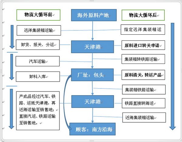 推出物流大循环后,明拓集团实现了采供销三合一:明拓在海外采购时以离岸价计,然后指定由中远或中海集团集装箱进行远洋运输;运抵天津港后,不报关清关而是做转关,集装箱不再卸装而是直接将集装箱利用铁路运输运抵包头,在包头清关卸货后;再将企业的产成品装载入集装箱,通过铁路运至天津港,之后集装箱直接上船,通过近海航运运抵福建和广东等地。物流大循环充分利用了各阶段衔接的便利条件,大大缩短了周转时间,保证了供货的稳定和及时性,提升了客户的满意度。