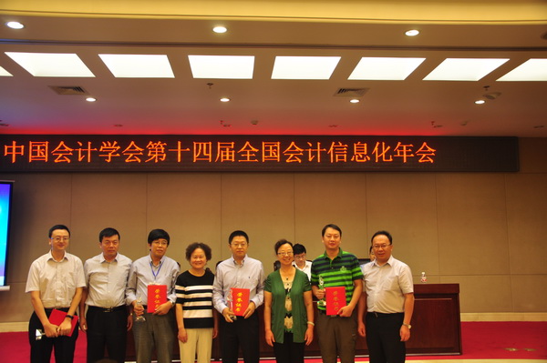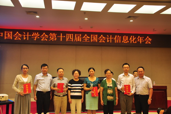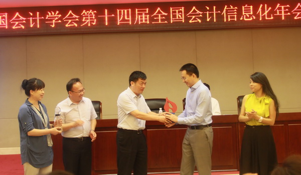 在大会闭幕式上,刘勤副院长和另外三位嘉宾为优秀论文和最佳辩手颁奖,本届承办方和下届承办方进行会徽和会标交接,刘勤副院长代表专业委员会进行大会总结。年会在热烈、和谐、友好的氛围中落下帷幕,第十五届全国会计信息化年会拟定于2016年4月下旬在温州举行。