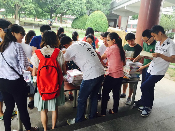 (撰稿、摄影:强蕾)8月20日,正午,室外,闷热,天空时不时地洒下似有似无的小雨。图书馆大门前,人声鼎沸,很是热闹。这是图书馆组织的新老生之间图书传递活动,亦即刚入校门的2015级的新生同学正在开心地挑选已毕业离校的2013级学长学姐捐出来的图书。