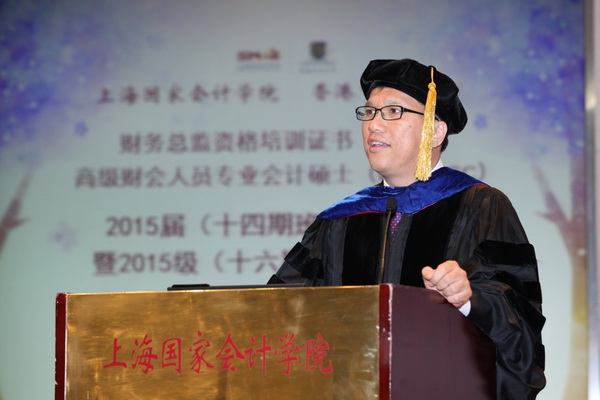 陈家乐院长是今年香港中文大学商学院新上任院长,他代表合作方也为典礼做出了精彩发言。他谈到自己与上海国家会计学院的多次结缘,也对EMPAcc项目多年的合作成果进行了肯定和鼓励,对新的学员和毕业校友送出了衷心的祝福。
