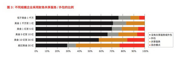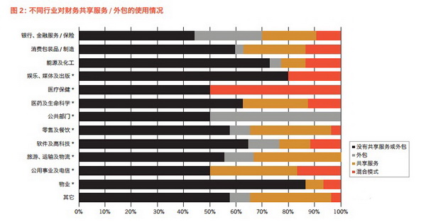 由上图可以观察到不同行业对财务共享服务/外包的使用情况存在一定程度的差异,其中银行、金融服务/保险,公共部门,以及公用事业及电信的使用程度较高。