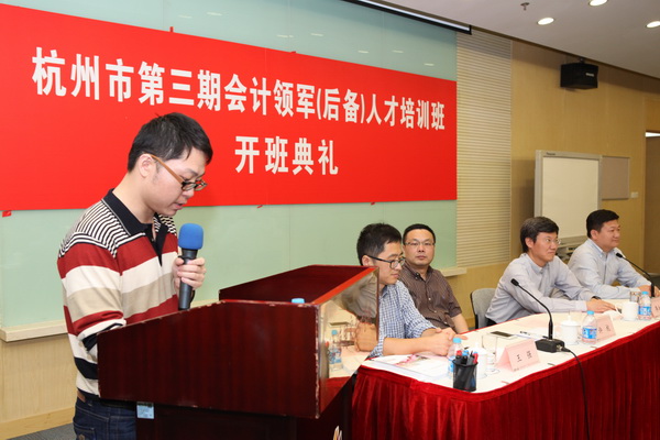 典礼最后,此期培训班学员代表,来自杭州永盛控股有限公司的财务总监张启同学代表全体学员发表讲话。张同学首先向杭州市财政局和上海国家会计学院表示感激之情,并对此次培训进行了积极的表态:第一,会提高学习认识,坚决完成学习任务;第二,会严格组织纪律,遵守各项规章制度;第三,会正确处理好学习和工作关系;第四,结合工作,学以致用。学员们反映热烈,一致认为张同学表达了他们的心声。