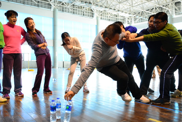 活动伊始,专业的攀岩教练将大家分成两队,在规范严格而不失趣味的热身后,带领大家迅速进入了团队组建拓展环节——合力取水。各位队员群策群力,明确分工,为了成功高效的取到离自己所在安全地近两米远的水,一起寻找支撑点,发力点,平衡点,通过全员合力取到了所有的水瓶,漂亮地完成了任务。