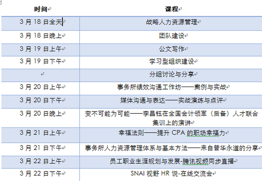 今年是我院连续第三年举办会计师事务所人力资源管理专题研修班。回顾过去的两年,第一年主要侧重专业领域基础知识及国家政策的夯实,如国家人才发展战略、人才管理制度改革、人才甄选、全面薪酬等;第二年侧重工作技能的提升,如EXCEL应用技能、绩效考核、互联网+、如何设计分级分类分模块的培训课程等。今年,在前期的课程设计期间,我们通过跟事务所人力资源负责人了解需求,并考虑到一些每年都来学习的学员学习的连续性,将今年的培训定位为:案例教学,实战互动;创新形式,移动互联。五天的课程安排如下: