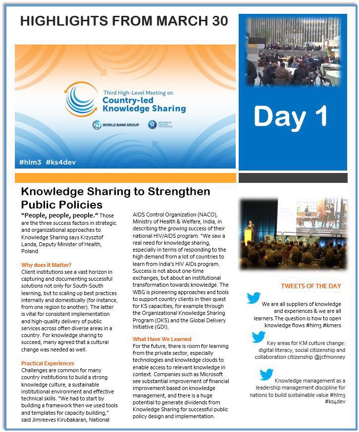 3月30至31日,来自全球77个国家和多边机构的400多名代表参加了由世界银行和韩国战略与财政部在美国华盛顿联合主办的第三届国家主导知识分享高级别会议(HLM3),旨在为实现全球发展目标与提升国家知识分享能力共同探讨相关经验和新的举措,评估各国机构更有效利用知识和经验开展公共服务交付的方法。受邀机构包括推动知识分享的政府部门、非政府组织、学术机构、智库和私营部门等。