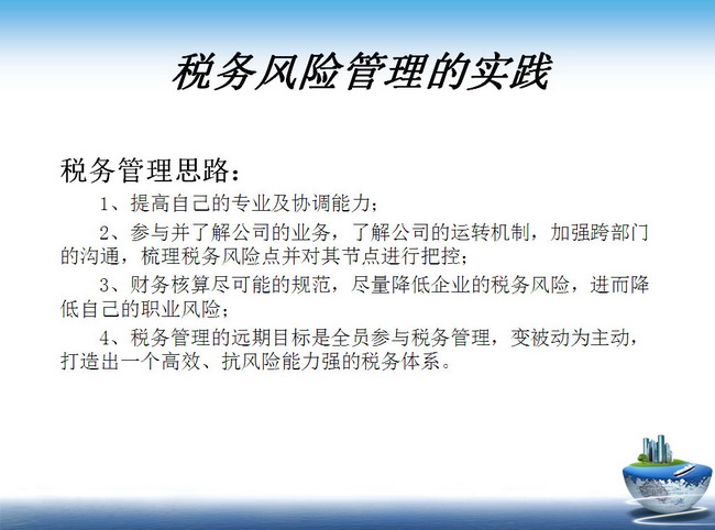 金久铭强调,不要等小问题变成大问题的时候,企业内部解决不了,就有可能受到法律法规的制裁了。嘉宾金久铭分享了自己的税务管理思路: 提高自己的专业及协调能力;参与并了解公司的业务,了解公司的运转机制,加强跨部门的沟通,梳理税务风险点并对其节点进行把控;财务核算尽可能的规范,尽量降低企业的税务风险,进而降低自己的职业风险;税务管理的远期目标是全员参与税务管理,变被动为主动,打造出一个高效、抗风险能力强的税务体系。