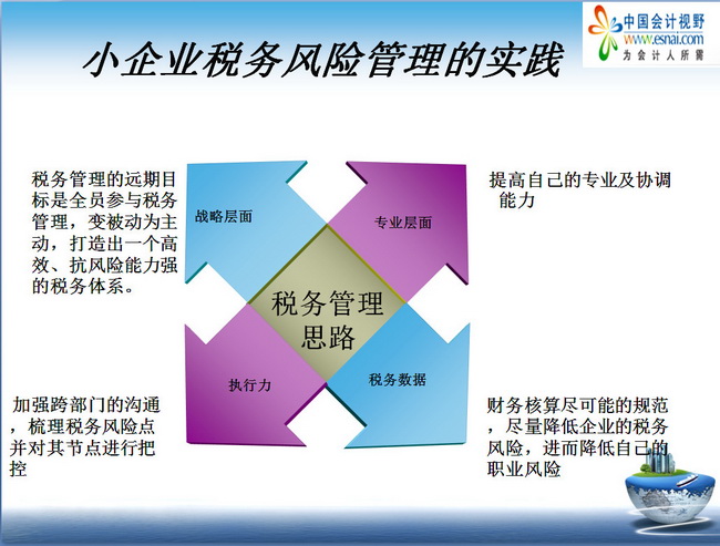 那么小企业在税务管理中出现的问题是如何造成的呢?金久铭总结为四个方面内容,首先,老板的“一言堂” 现象,公司管理层的风险意识淡薄。其次,财务人员的专业胜任能力不足,对事前的把控不到位,事后的补救措施无效,增加了公司的税务风险和自己的职业风险;第三、信息与沟通不畅。财务人员无法和业务部门以及行政部门等相关部门进行有效的沟通,缺乏对事实真相的认识或者说对业务的实质不能准确了解,这也会增加公司的税务风险。四、缺乏监督与改进机制,无法对有效的对业务进行事前管理和事后补救。