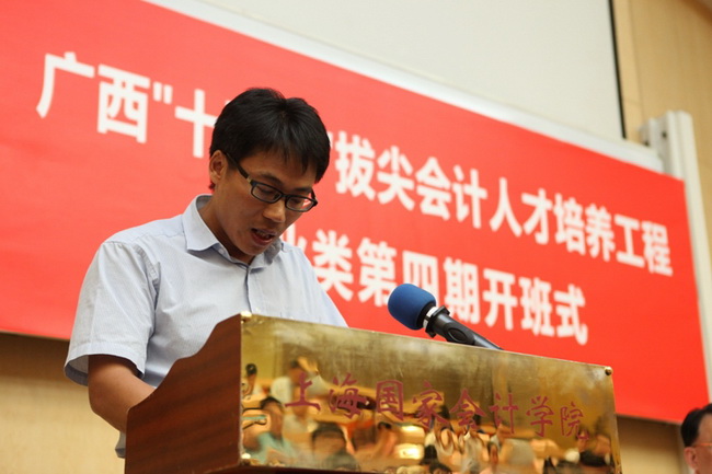 班长黄鸿乙代表全班发言,他表示,感谢财政厅对人才培养的重视让他们有机会走进向往已久的上海国家会计学院。一带一路政策下,广西发展面临新机遇,学员面临新情况新问题,学员将争分夺秒如饥似渴的学习,提升综合素质,为社会创造更多的价值。绝不虚度宝贵时光。