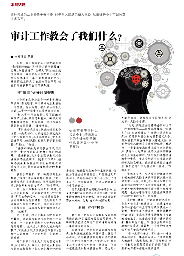 “初入审计行业的新人要不断地接触客户、业务,锻炼思考能力。将你见到感性通过思考上升为规律,这种归纳总结的能力很关键。”孙含晖说。