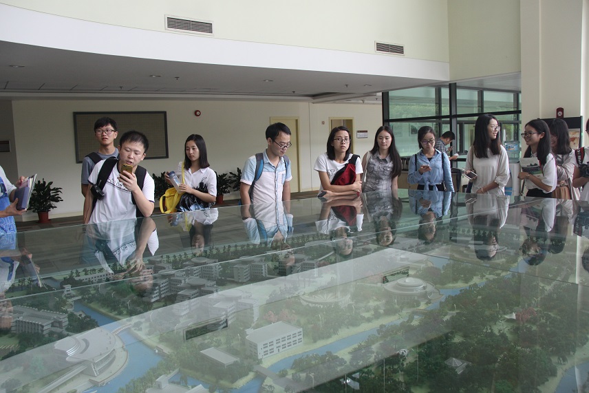 导览员在一教的学院模型前为大家讲解了SNAI的优越环境。