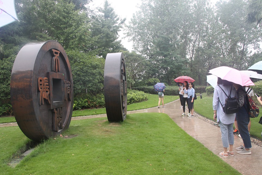 “不做假账”的校训刻印在铜钱上,细雨中显得更为严肃庄重。