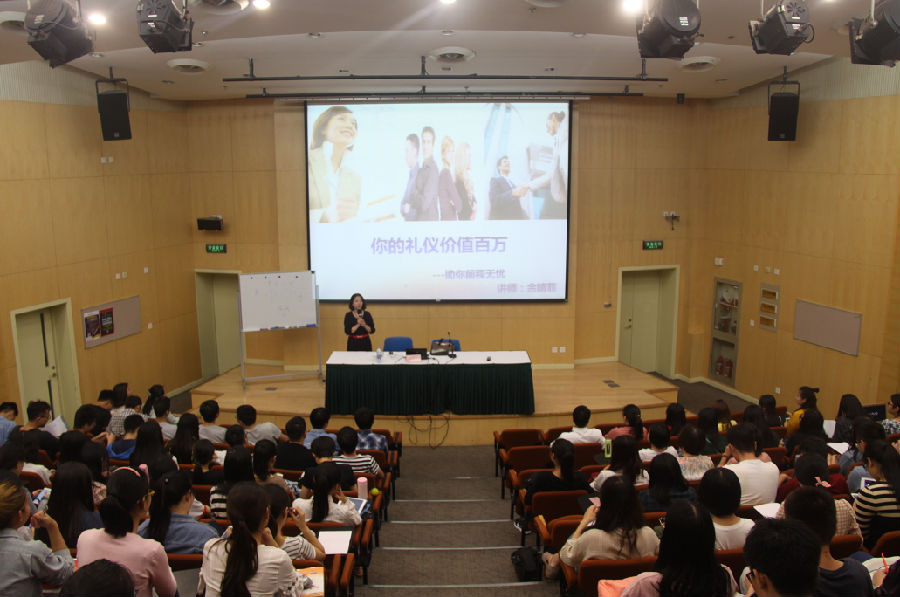 (撰稿/张晓涵;摄影/孙艺文)为帮助研究生解决求职过程中遇到的疑难问题,提升学生的形象素质、行为素质及职业素养,9月22日18时,学院就业指导中心在200人报告厅举办了一场“求职与商务礼仪”专题讲座。本次讲座特邀请高级人力资源管理师、礼仪培训师、世博会培训师余晴菲老师做主讲。2015级、2016级研究生早早地来到会场外等候,讲座在同学们的期待声中拉开帷幕。