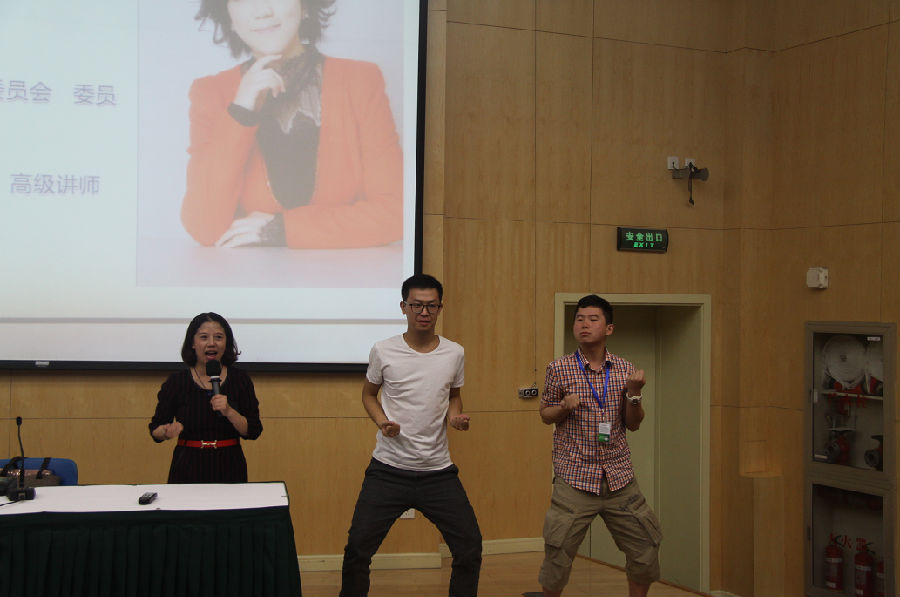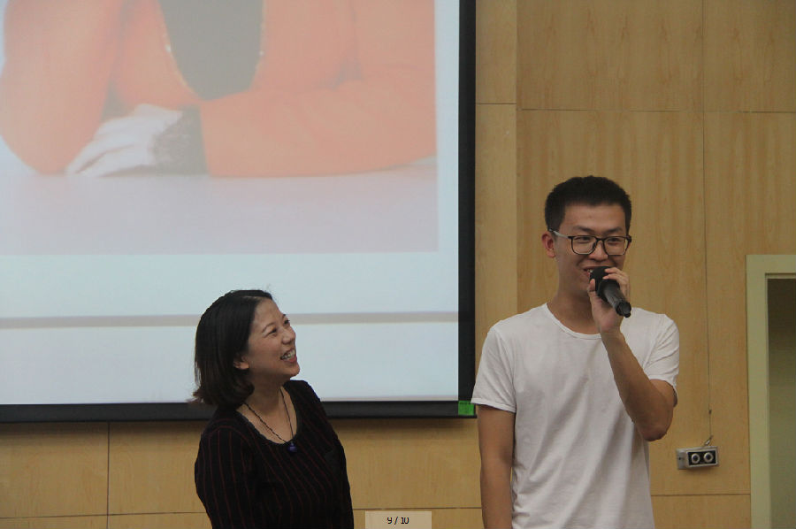 望,是面试至关重要的第一步,面试者的面部表情和仪容仪表会直接影响到考官的第一印象分。余老师总结了在面试时哪些表情是最忌讳的,哪些表情能得到较高的印象分,同时还向我们展示了正确的着装打扮,以及正确的站、坐、蹲、走的姿势。闻,就是指声音了。余老师亲自演示了如何用丹田发声增强自己的气场,并指导大家进行现场练习。问,是指面试者在面试时哪些问题该问,哪些问题不该问,问题要怎么问。在“切”的这个环节,余老师选取了2016级税务班卫江昊和2016级审计班邓翔东两位同学上台进行互动,他们进行了“丹田狮吼功”PK,并进行了握手、拥抱,然而这些看似十分平常的动作,却蕴含着大大的学问。余老师又对握手、拥抱和鼓掌的正确方式进行了讲解。