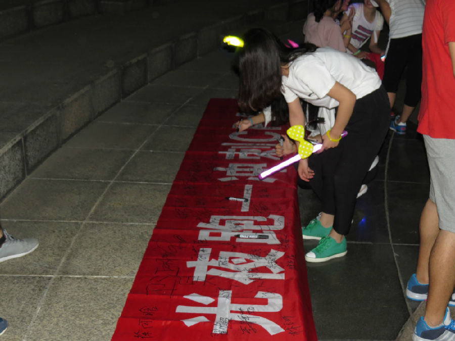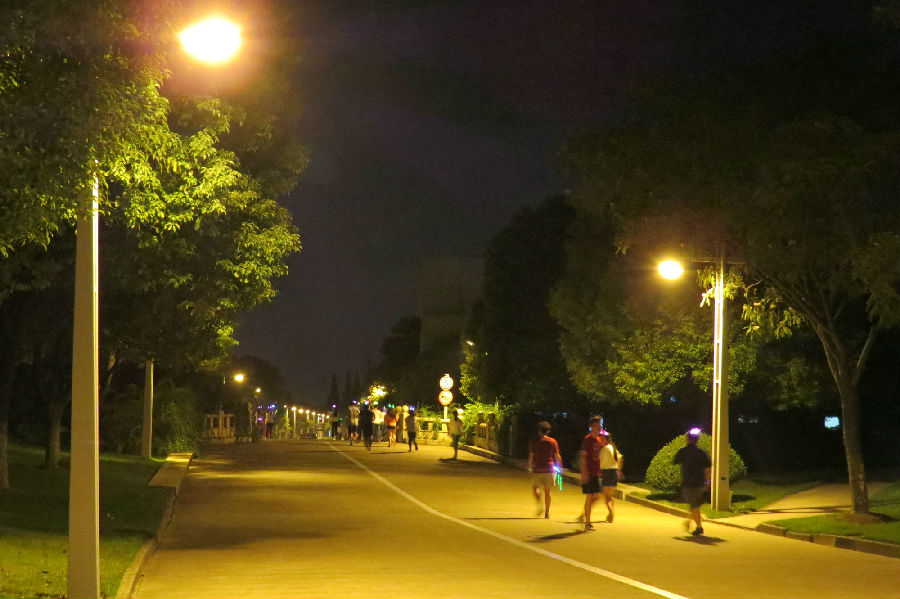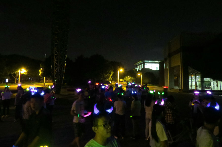 活动当晚,同学们准时赶到起点公正柱集合,领取发光头饰和荧光手环,在装扮完毕后集体在公正柱下合影留念。随后,参与者随机分成8组,由领跑人员带领从公正柱出发,途经第一教学楼、注册中心、远程信息楼、第三教学楼、风雨亭、篮球场等我校标志性建筑。此前,大多数同学还在图书馆伏案自习,开跑后大家都调整状态,挥洒汗水。其间各组成员风格迥异,口号声、说笑声不绝于耳。奔跑的身姿、闪烁的荧光在上国会的校园中形成了一道亮丽的风景。活动的最后,所有人都安全返回,并在半圆形广场的宣传横幅上签字并拍照留念。