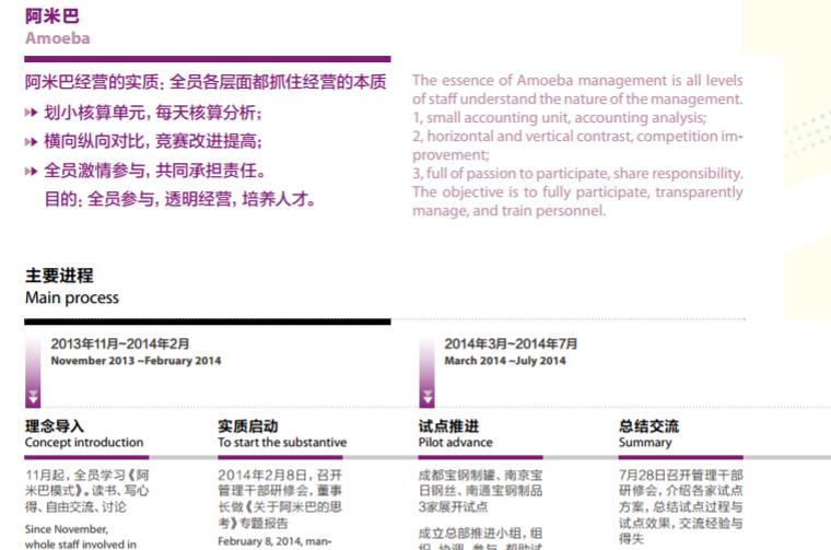 “微信运动可以实时显示好友的步数、排名。那么我们企业运营中,能否做到每天出报表?”范松林说,“可以!”宝钢金属的总体思路是,整合运用阿米巴等管理会计工具,调动全员激情,抓住经营本质,使得人人成经营者,引领企业经营模式转型,达到提升EVA的目的。