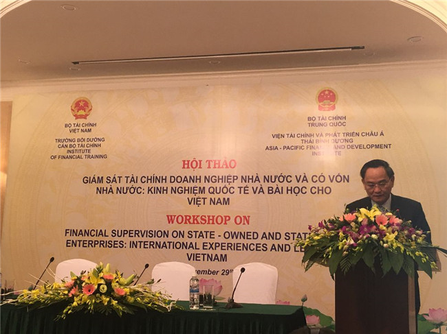 11月29日,由亚太财经与发展学院(AFDI)与越南财政部财政干部学院(IFT)共同举办的中越“国有企业财政监管”培训班在越南河内举行。越南财政部副部长阮友智先生、财政干部学院院长黄成厚博士以及亚太财经与发展学院彭润中处长出席本次培训班开幕式并致辞。来自越南财政部以及各省财政系统和研究机构的100多位代表参与了此次培训。