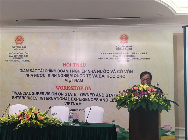 阮友智副部长在致辞中谈到,越南对国有企业及国家参股企业的监管复杂,且投资主体多元,因而缺乏有效的财政监管手段。希望通过本次培训,通过中越两国财政管理领域专家的讲授与分享,将中国在国有企业财政管理方面的先进经验更好地与越南的实际环境相结合,帮助越南提高和完善在国企监管方面的手段及方法,同时也非常感谢亚太财经与发展学院为越南财经官员提供了良好的相互交流与学习的平台。