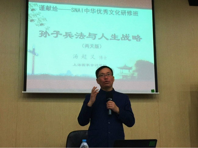 上海国家会计学院“中华优秀文化研修班”第一门课程是《孙子兵法与人生战略》,由汤超义博士主讲。汤博士把他的《孙子兵法与人生战略》之研究方法总结了两句话:“航拍与探秘相呼应,兵法与人生相结合”,两天时间,汤博士带着我们一起航拍、探秘了《孙子兵法》,体味了人生。