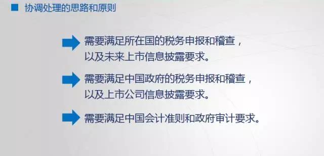 第二个要满足的,当然我们是中国企业,要满足中国政府的税务申报和稽查,同时要满足中国会计准则和政府审计的要求,所以这个原则,我想我们是必须要遵循的。那么现在实际上在处理这个账务的时候有两种模式,一个是一套账处理模式。就是说把所有的经济业务,按照所在国会计准备的要求,或者按照中国的会计准则的要求,形成财务报告都可以。你可以按照所在国,也可以按照我们中国的。但是这个报告如果按照所在国的会计准则,那你必须要调整符合中国会计准则。回来我们还有一套体系。一套账有优势也有一些问题,一套账优势在于工作量比较少,我们调整就可以了。大的业务没有什么太大差别,前面我没有用原来的介绍,现在很多语系的会计准则要求,跟国际财务报告体系的趋同已经越来越密切。所以要调整的量是越来越少。如果适用就调整的比较简单,但是有一个很大的问题,就是这种调整是基于在我们对所在国和对中国会计这种差异非常了解的基础上才能进行。这个很有可能出现挂一漏万的情况,容易出现遗漏和差错,一旦主线遗漏和差错,有可能造成很多的失误在里面,这是我们的体会。所以一套账有一套账的好处。
